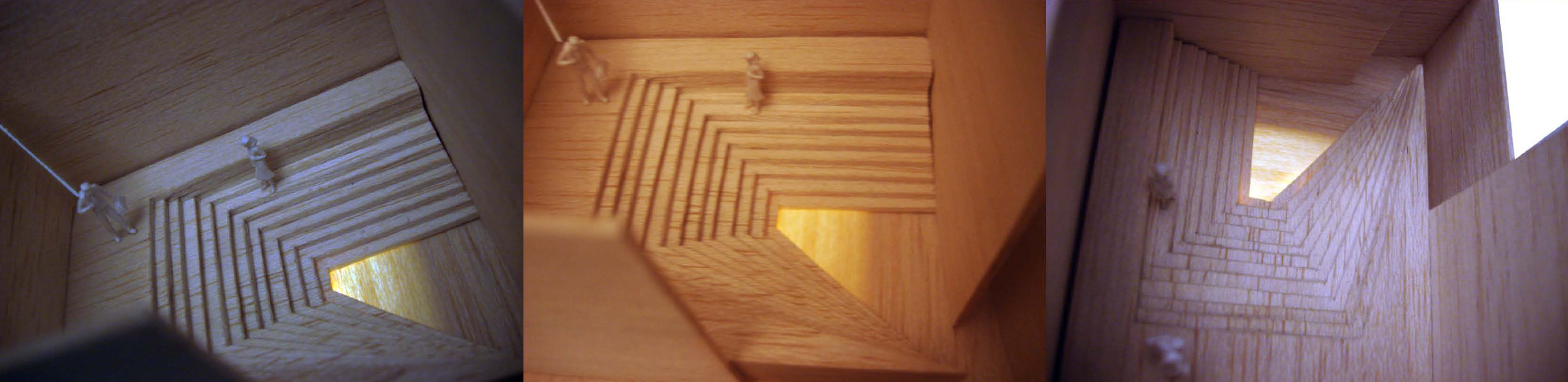 En este memoria l, se trata de seguir un recorrido a veces estrecho, remata en una serie de escaleras que nacen de un mismo punto geométrico, a su vez al interior el objeto esta envuelto en muros con una ranura vertical que permite el paso de la luz. La intención es generar un recorrido de día en donde al final de las escaleras no quede mas que voltear y ver el cielo.