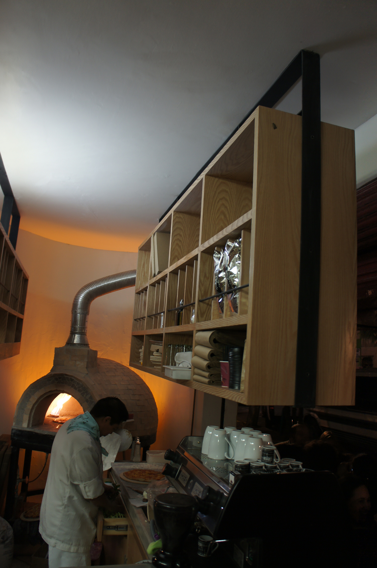 Este ejercicio se basa en la idea del escaparate, una cocina abierta. Un par de barras de concreto al interior/exterior muestran el proceso de hacer pizza en un horno de piedra.