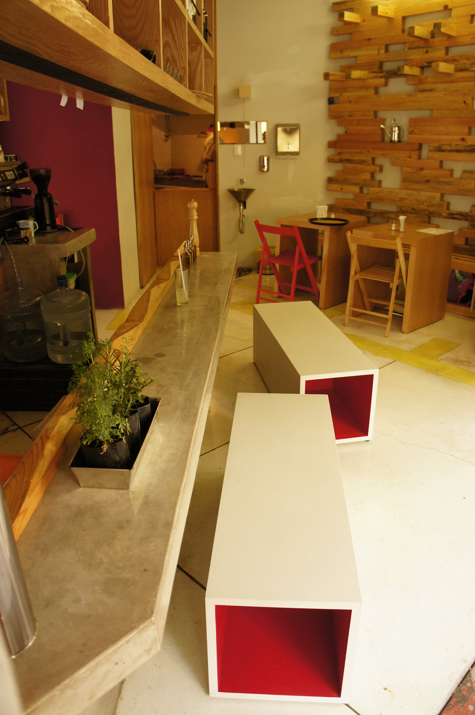Elementos como la madera de encino y pino, se aplican de distintas maneras para ser objetos que se despliegan o deslizan: mesas, bancos, puertas, muros. Por último la apropiación temporal del espacio público genera una relación cercana y necesaria del barrio con sus comensales.