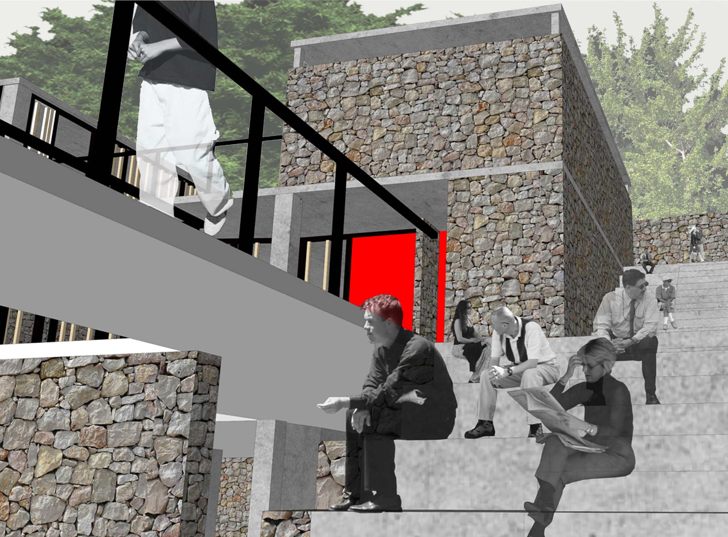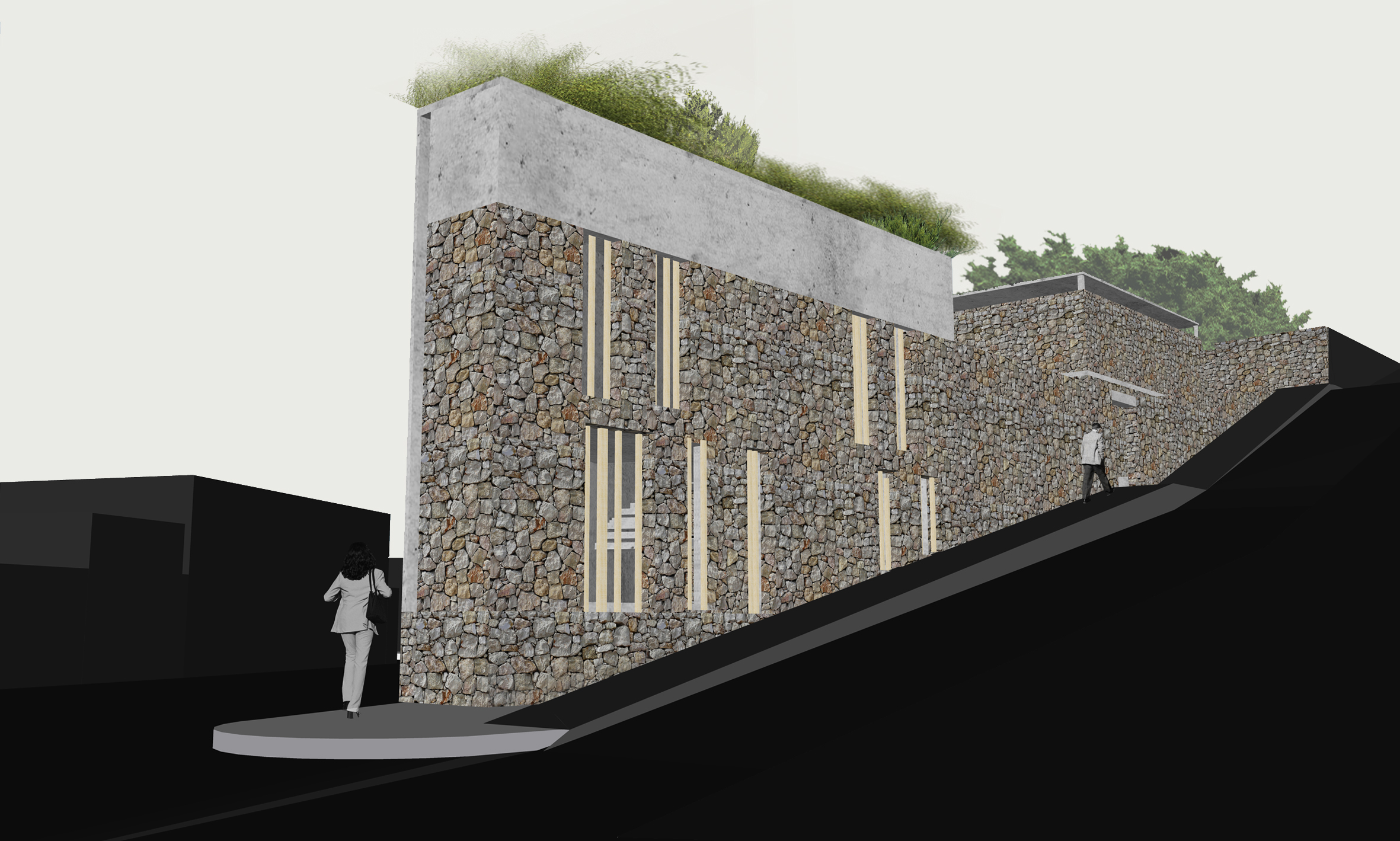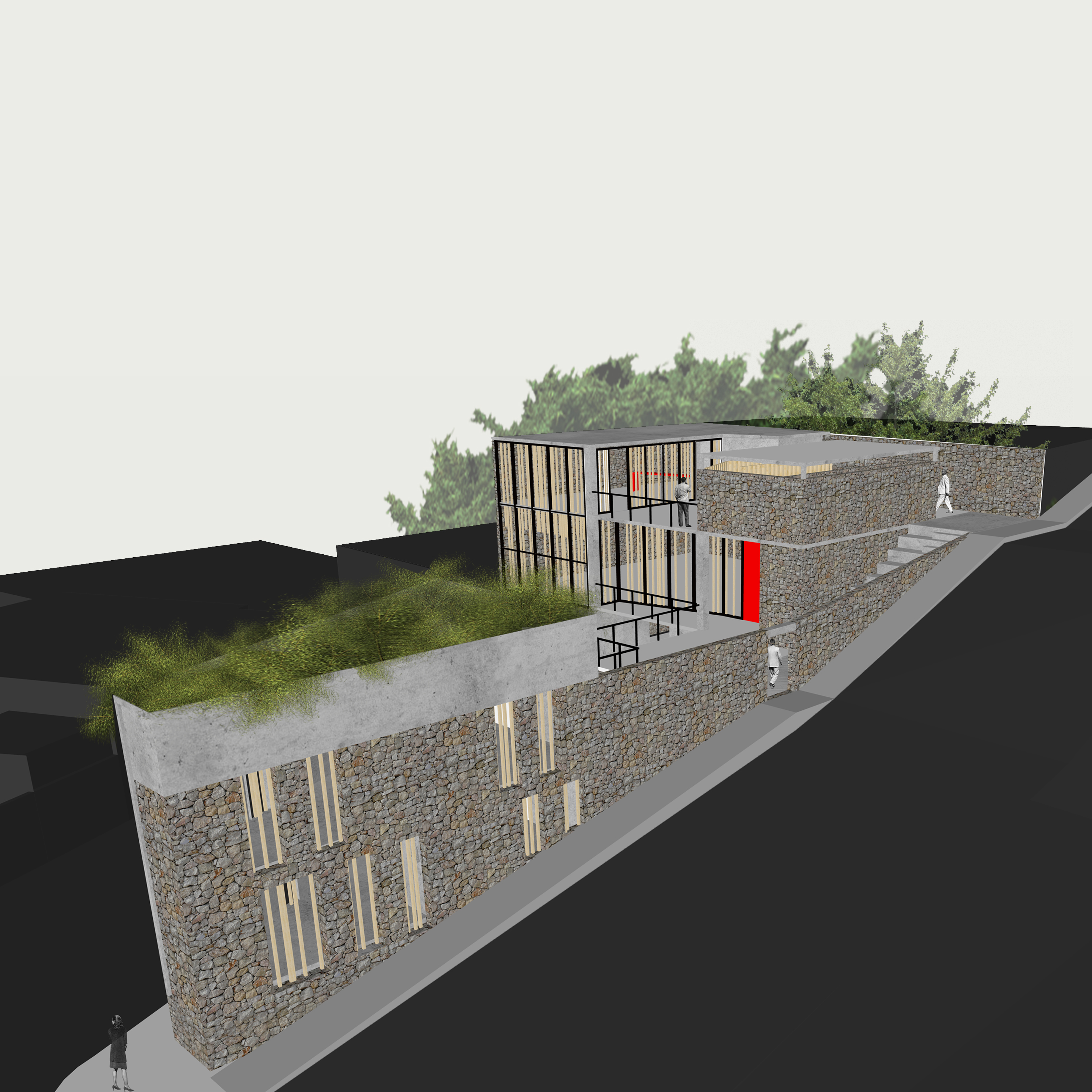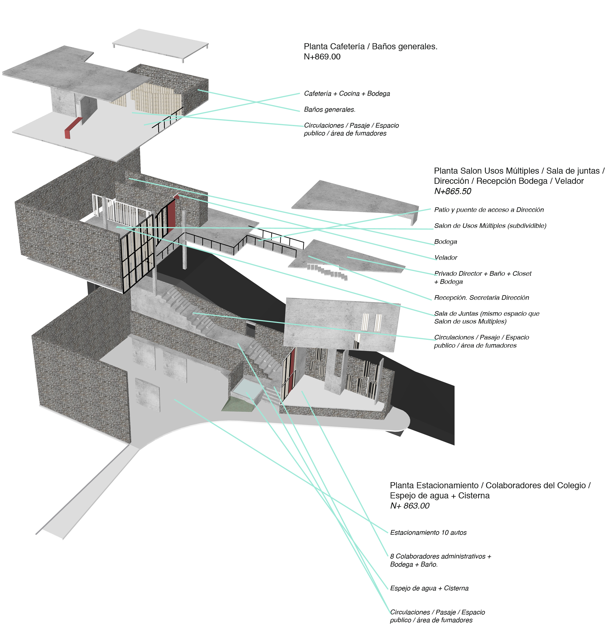 La propuesta parte de la idea de generar un espacio publico dentro de la institución, un pasaje, un vestíbulo que conecta los diferentes usos del colegio y las dos calles que rodean al predio. Aprovechando su topografía se generan una serie de plataformas que se vuelven patios y se conectan por medio de puentes o escaleras que también son bancas de un pequeño foro al aire libre. Ventilación cruzada en los edificios, azoteas verdes y captación de agua pluvial.