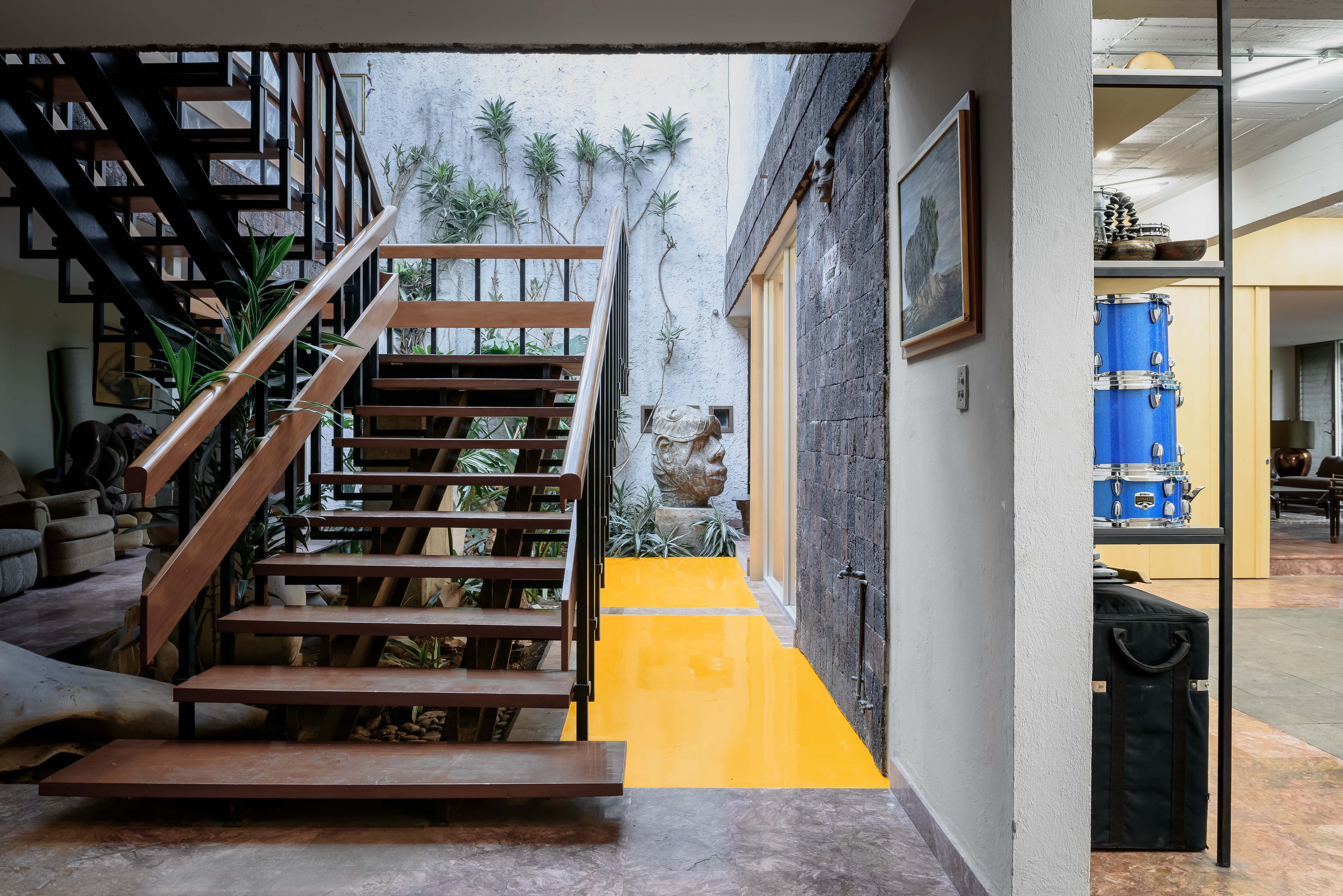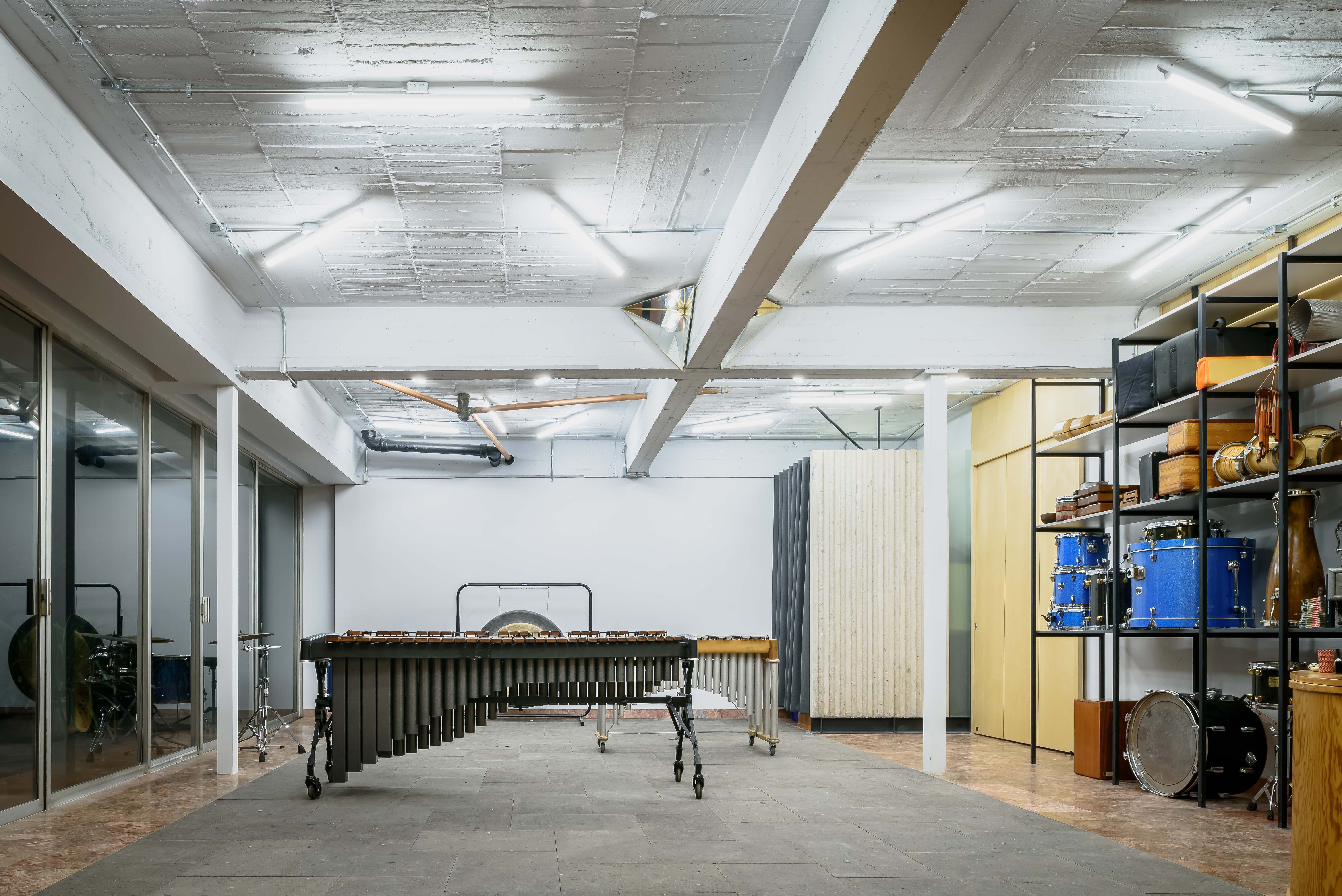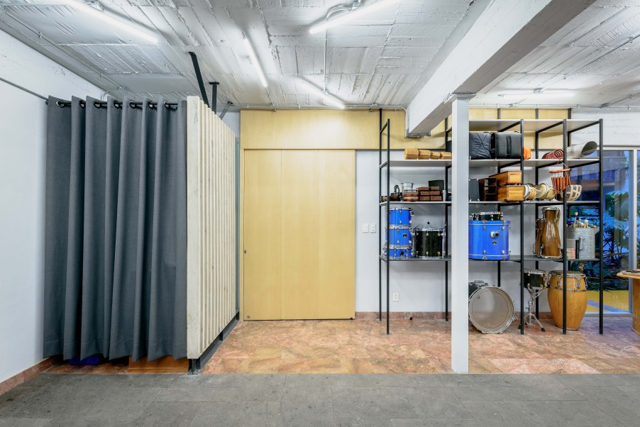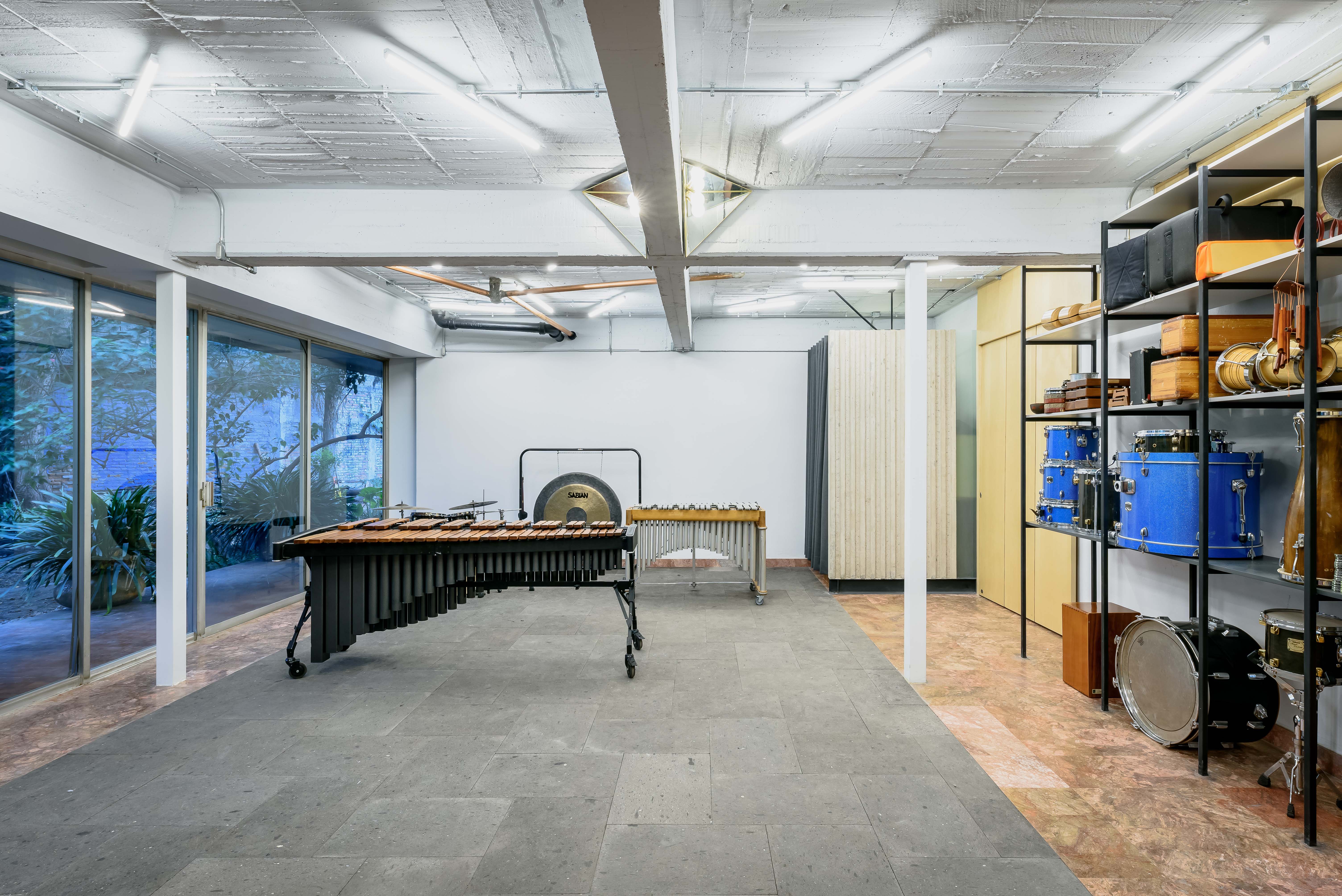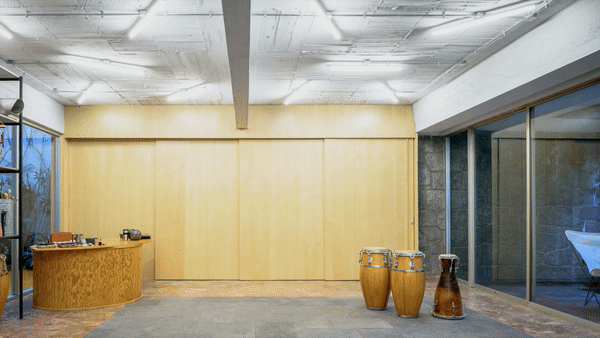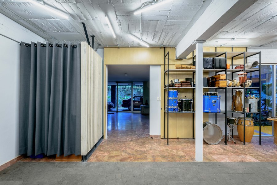 Acciones: Replanteo de circulaciones alrededor del estudio mediante puertas corredizas que expanden y contraen el espacio, pisos epóxicos y de recinto, cancelerías, cierre y apertura de vanos. Iluminación adecuada para las actividades realizadas, ampliación de la altura de entrepiso, mobiliario, bodega.