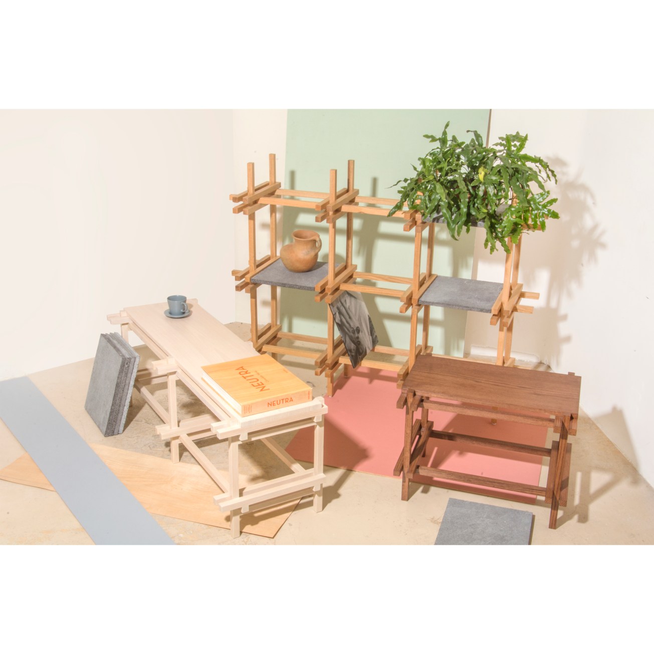 “Barítono” nace por la necesidad de integrar el diseño de mobiliario en los proyectos de arquitectura, la colección esta compuesta por estanterías, mesas y bancos inspirados en el movimiento neoplasticista, la arquitectura brutalista y los sistemas constructivos Japoneses.