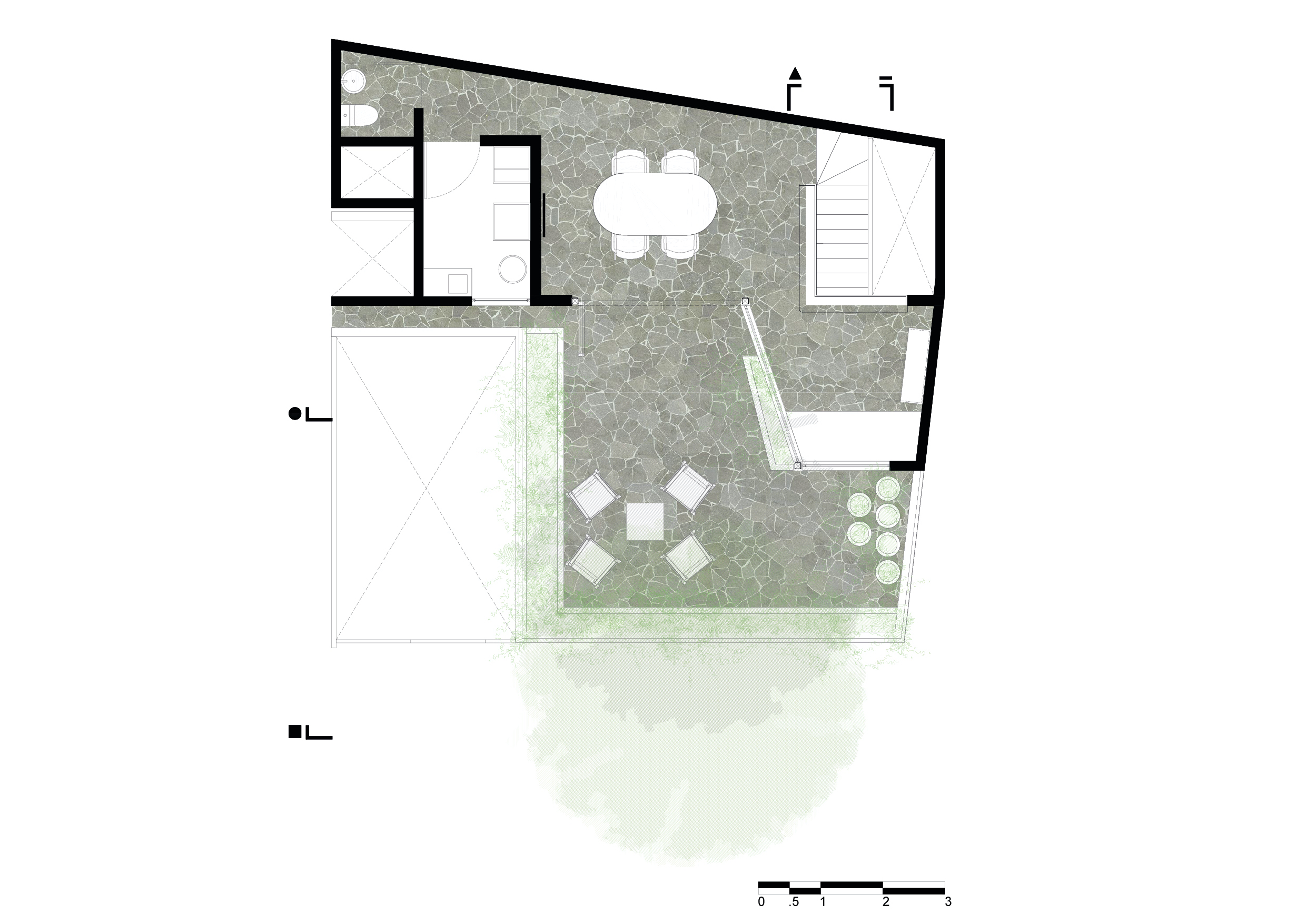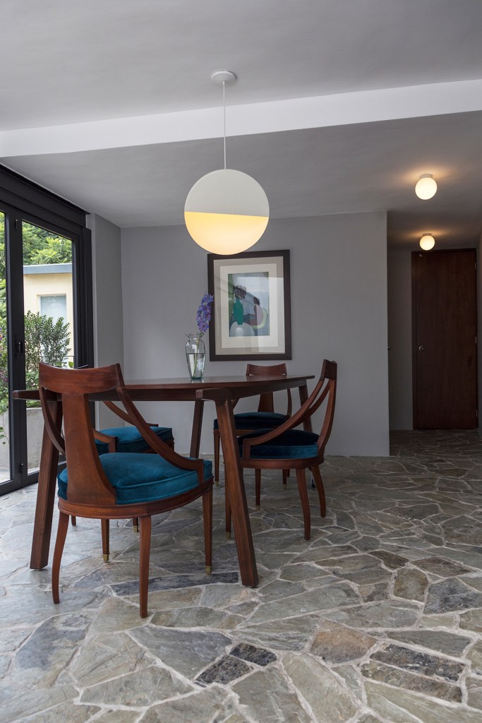 Mediante la aplicación en piso de una monotextura de laja de piedra, tratamos de desaparecer la frontera entre el interior y el exterior, la piedra recorre y unifica todos los espacios. Por medio de un cancel de piso a techo es posible abrir y conectar el salón interior con el exterior, la terraza y el árbol.