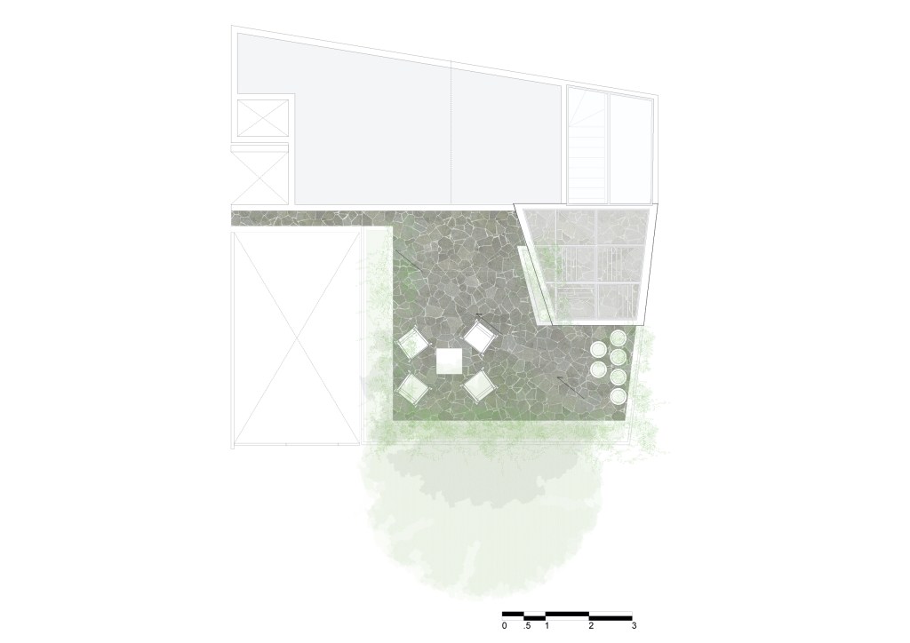 La primera zona a intervenir resultante del plan maestro, es un espacio subutilizado donde fue posible adecuar una prexistencia como salón multiusos: Una clase de yoga, una reunión, una cena. Contiguo a este espacio construimos un nuevo estudio y una terraza bañados por la magnífica sombra del árbol.
